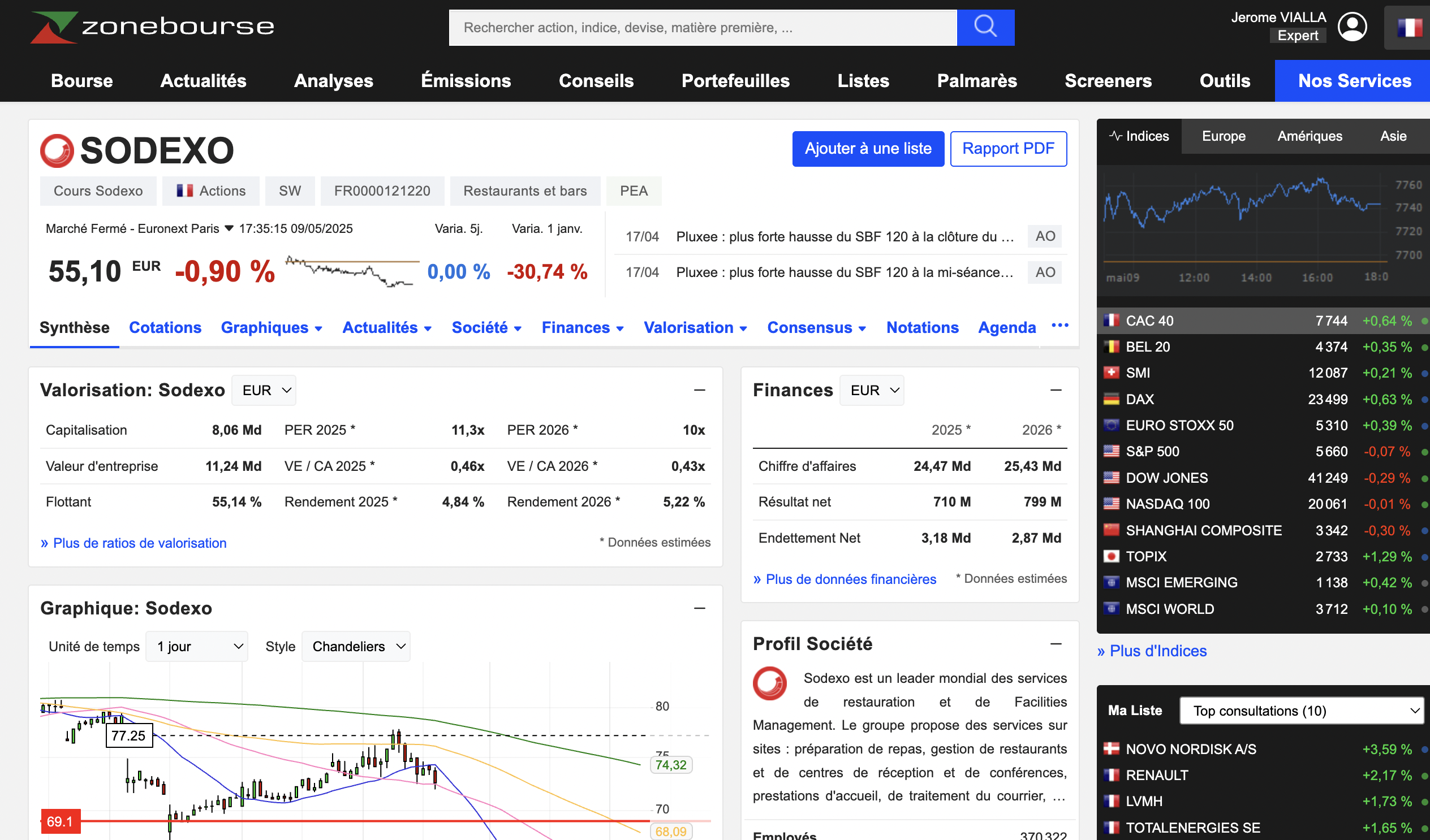 Pour cela, nous allons utiliser l’outil Zonebourse, le Chat GPT des investisseurs, car il permet de suivre les marchés financiers en temps réel et d’accéder à des données financières complètes sur des milliers d’entreprises dans le monde. Aussi bien utilisé par des particuliers que par des professionnels, Zonebourse fournit les outils essentiels pour comprendre, comparer et décider :