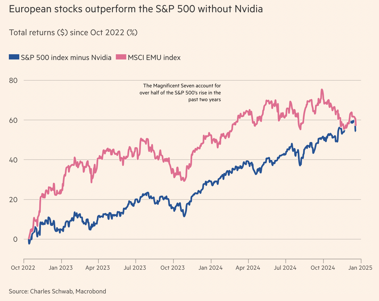 Un fait surprenant : si on retire Nvidia du S&P 500, l'Europe surperforme les USA depuis 2022 ! La tech ne représente que 8% du Stoxx 600 contre plus de 30% aux USA. Les actions européennes se négocient aussi avec une forte décote historique, offrant plus de potentiel de hausse.